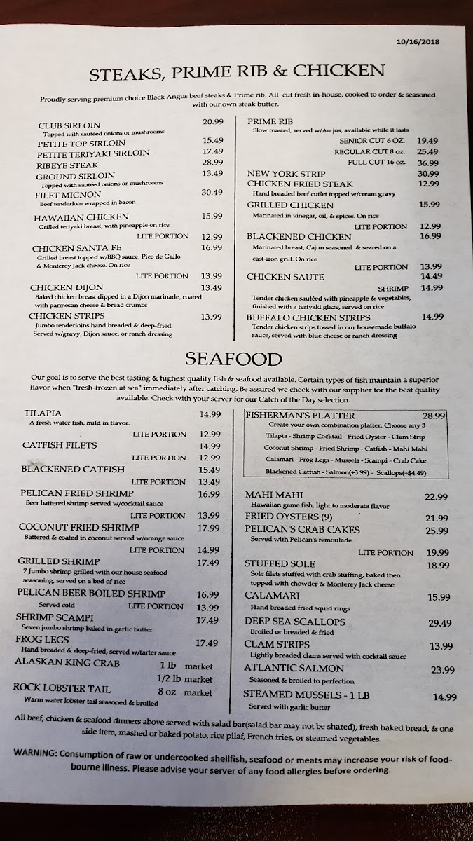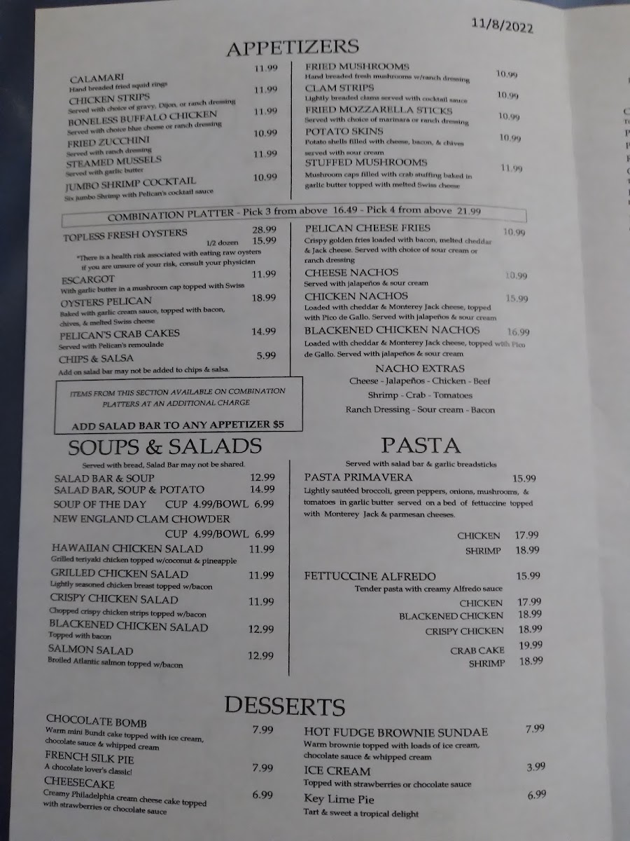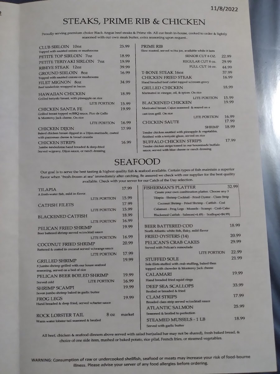 The seafood selection shines brightly, with the Fisherman’s Platter and iconic beer-battered fried shrimp earning rave reviews. With a robust salad bar overflowing with fresh ingredients, diners enjoy a well-rounded meal at an exceptional value. Guests applaud the attentive service and inviting atmosphere, making Pelican's perfect for both casual outings and special celebrations.
